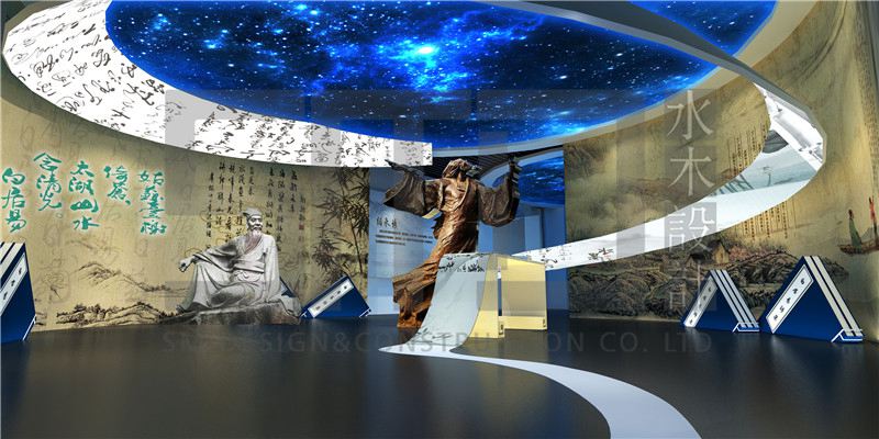 以具有江南水乡文化特色的“黑、白、灰”为基调,融入太湖的“蓝”、“绿”共同构筑本馆的整体用色处理。展陈设计上提取太湖文化符号,以场景化形式、多媒体互动形式等来强化展陈的视觉感及参与互动性。